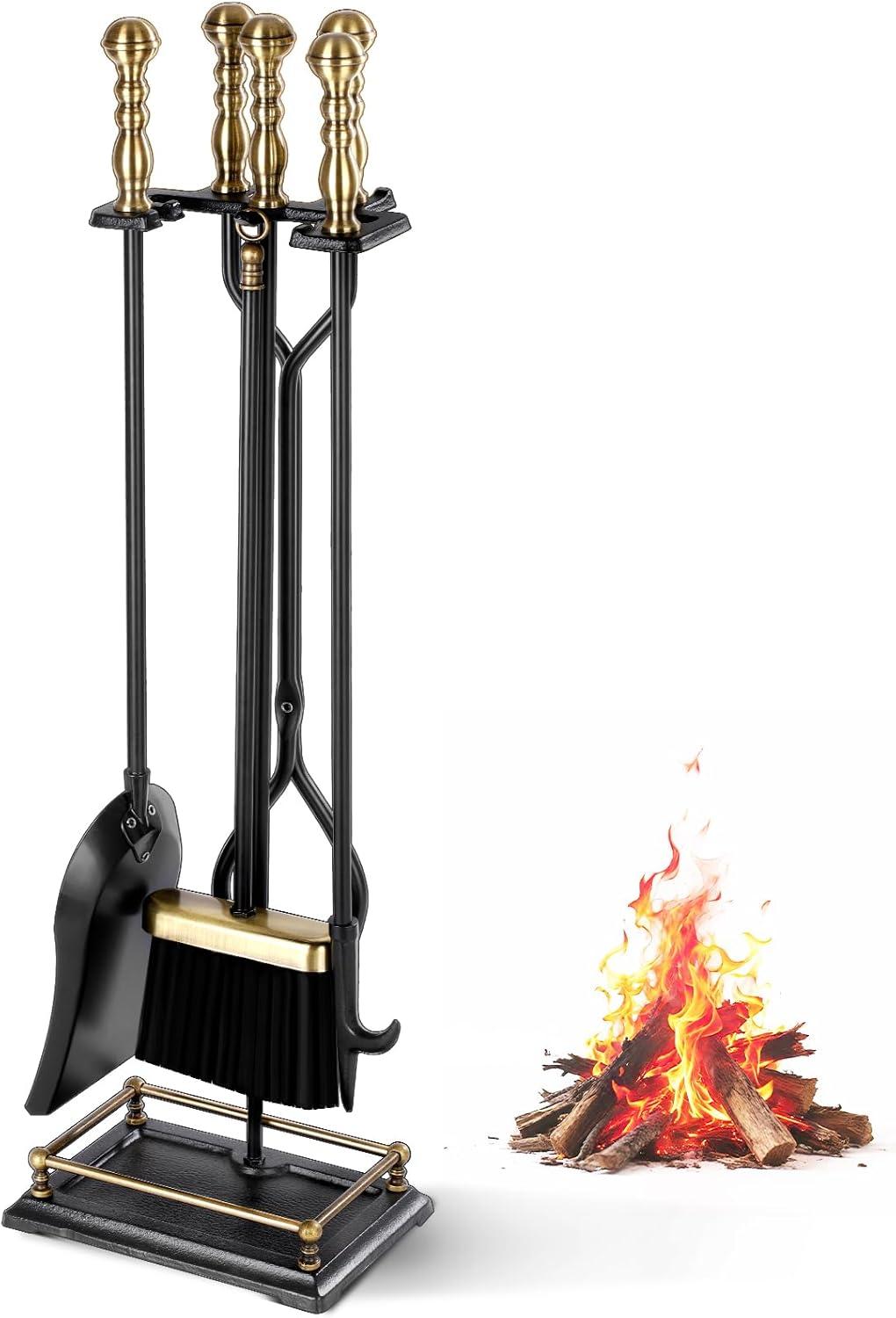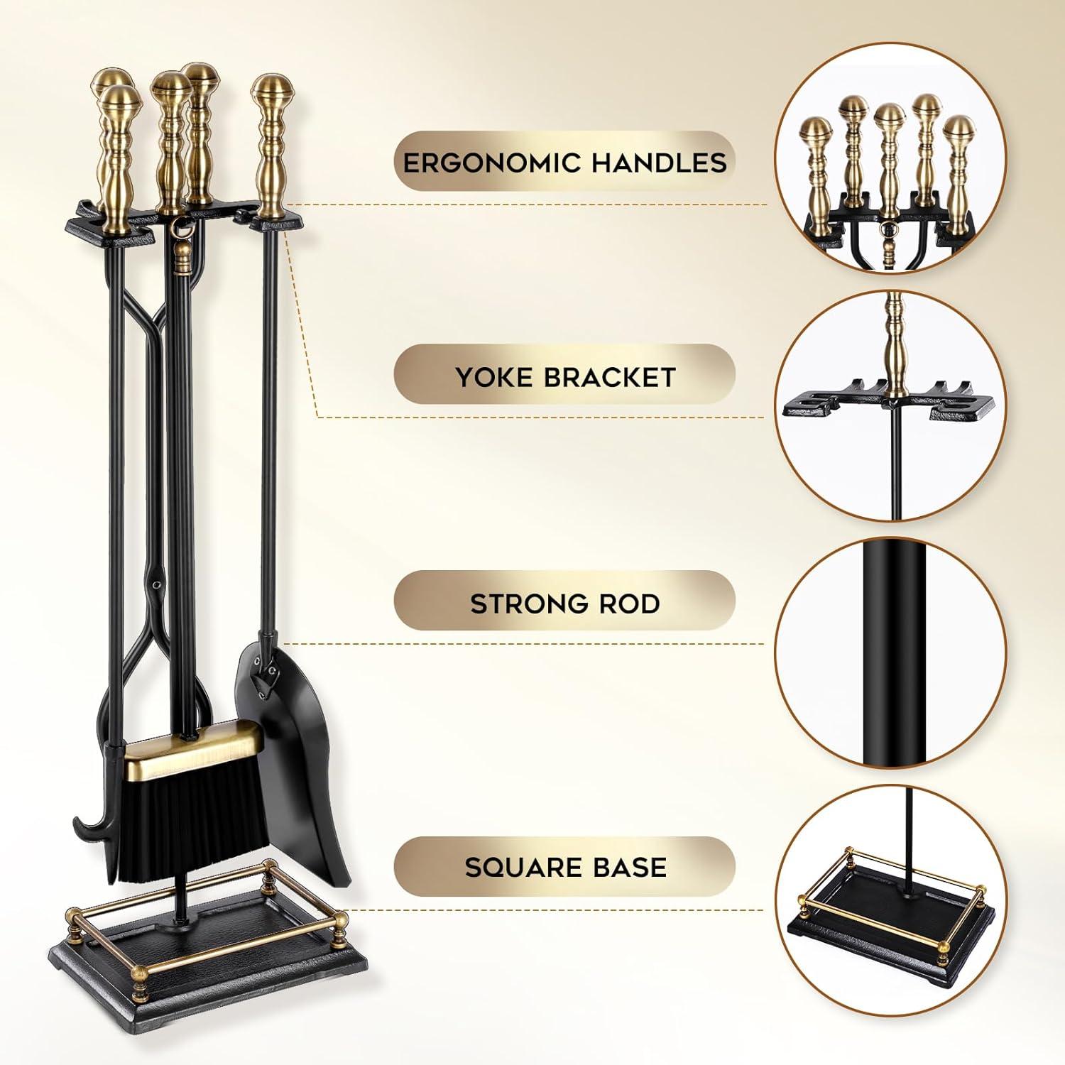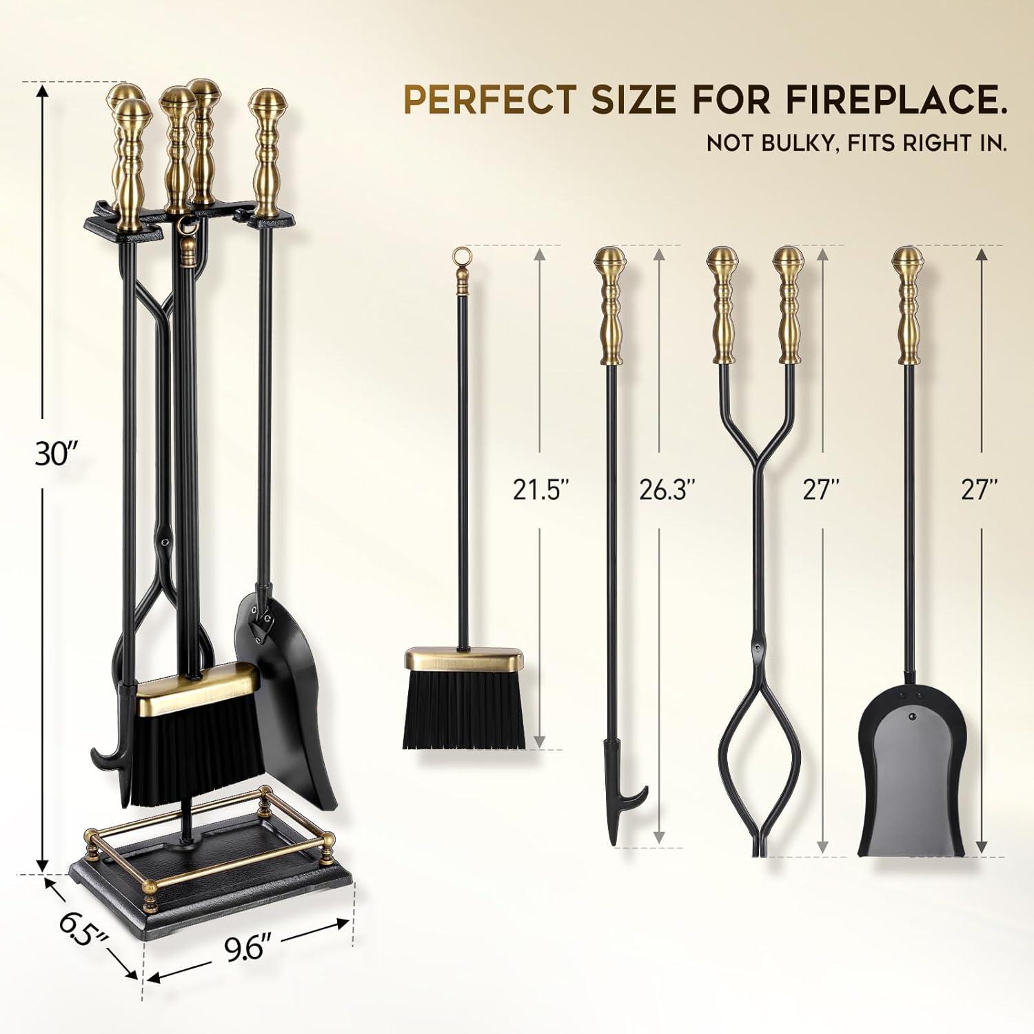 Perfect Size & Complete Set: Includes fireplace tongs, poker, brush, shovel, and a compact yet stable base; total height is 30 inches, base footprint is 9.6” x 6.5”; tong length is 27 inches; poker length is 26.3 inches; brush height is 21.5 inches; shovel length is 27 inches; ergonomic brass handles and sturdy 0.4-inch diameter rods make this a durable fireplace tools set for daily use