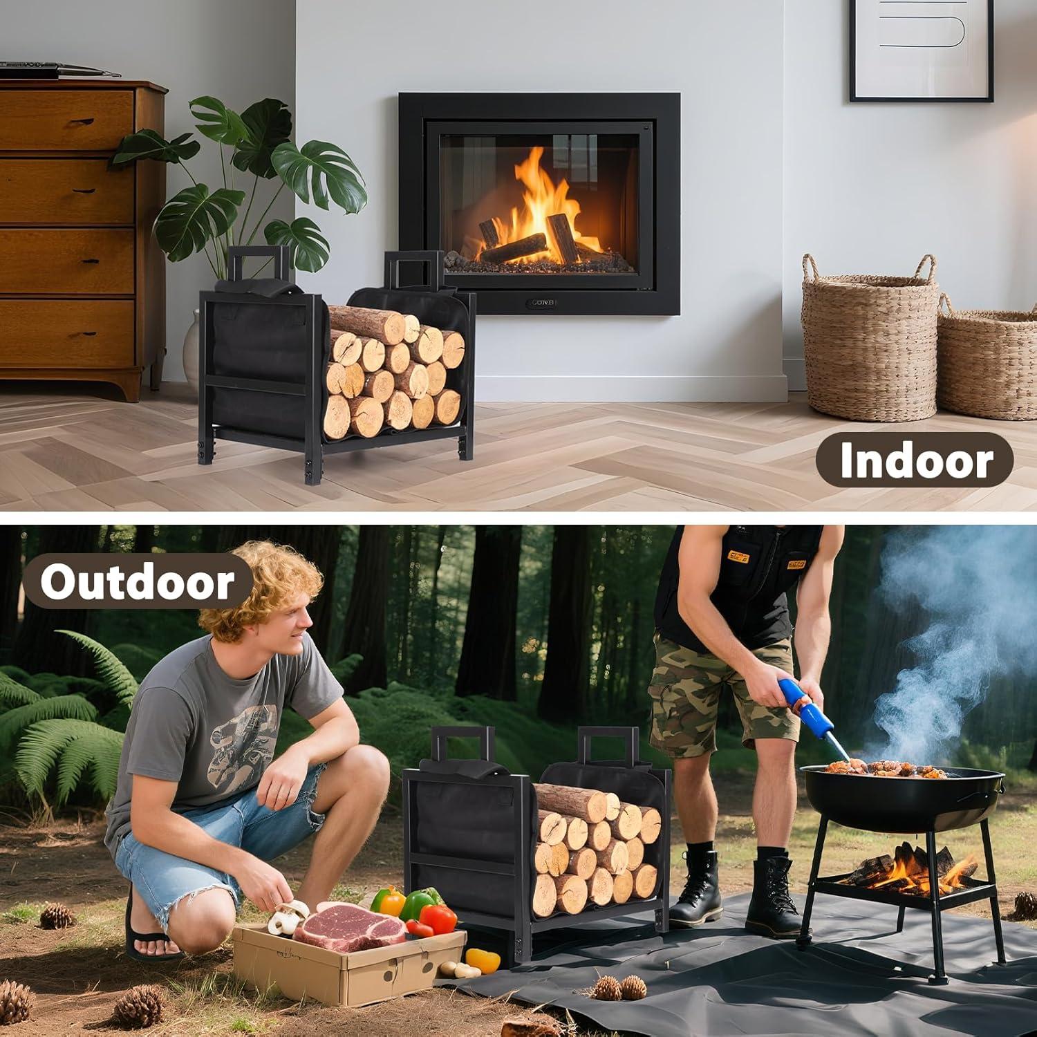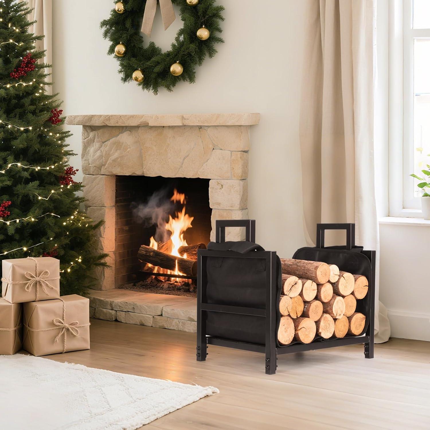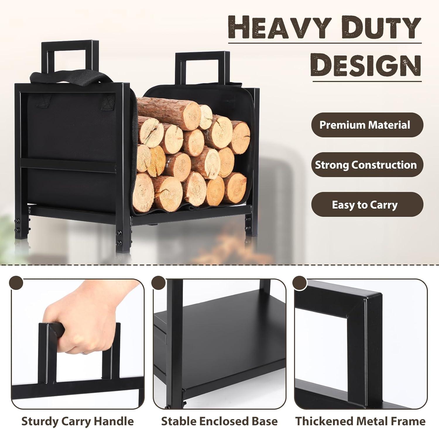 FEED GARDEN Firewood Rack Outdoor Indoor with Log Carrier Bag, 17.7 Inch Heavy Duty Steel Wood Holder for Fireplace, Compact Wood Rack for Firewood Storage, Black